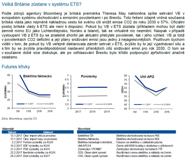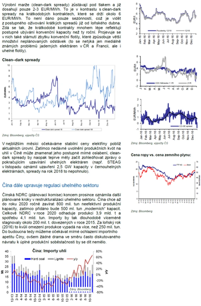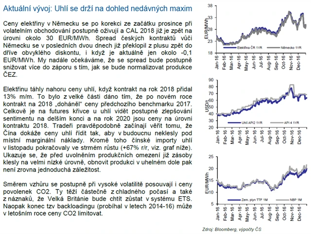 Ceny elektřiny v Německu se po korekci ze začátku prosince při volatilním obchodování postupně ožívají a CAL 2018 již je zpět na úrovni okolo 30 EUR/MWh. Spread českých kontraktů vůči německým se tento týden již překlopil z plusu zpět do dříve obvyklého diskontu, i když je aktuálně jen okolo 0,1 EUR/MWh. Nadále očekáváme, že se spread bude postupně snižovat více do záporu s tím, jak se bude normalizovat produkce ČEZ.