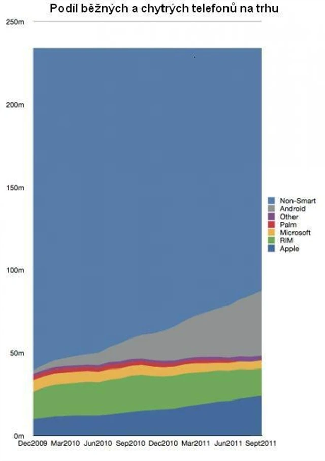 Jak je vidět na grafu, chytré telefony jsou opravdu v kurzu a posilují svou pozici na trhu. Jedinou nevýhodou je, že graf operuje s daty 3 měsíce starými. Takže v nich není zahrnutý nástup iPhonu 4S.