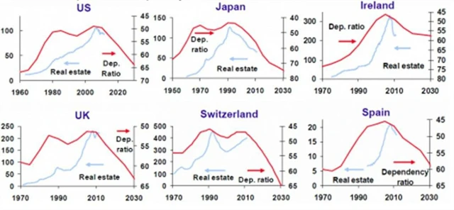 Vývoj cen na nemovitostním trhu je úzce svázán s demografickým vývojem. Grafy z dílny analytiků banky Credit Suisse porovnávají vývoj nominální ceny nemovitostí (nominal real estate value) a míru závislosti (dependency ratio), tedy požadavku na bydlení ve vyspělých ekonomikách. Stárnutí populace ve vyspělých státech se již začíná odrážet ve vývoji tamních nemovitostních trhů, velmi patrné je to již v Japonsku. Další vyspělé země by měly tento "trend" následovat.