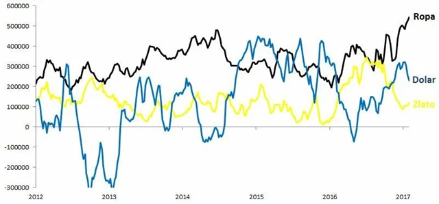 O názoru trhu na jednotlivá aktiva vypovídá statistika pozic obchodníků (CoT - Commitments of Traders). Graf níže ukazuje, jak investoři a spekulanti (Net Non-Commercial Open Interest) budují, či naopak likvidují pozice v ropě, zlatu a americkém dolaru.