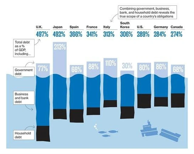 Pozornost investorů se upírá na "nejhůře zadlužené ekonomiky" eurozóny v čele s Řeckem, Itálií nebo Španělskem. Jak ovšem ukazuje graf, největší celkové zadlužení mezi vyspělými zeměmi má Spojené království - téměř 500 % HDP. Většina tohoto "dluhového ledovce" se skrývá pod hladinou v podobě dluhů domácností, firem a bank. Problémem zemí PIIGS ovšem zůstává složité financování státních dluhů, země si půjčují s nejvyššími úroky v historii.