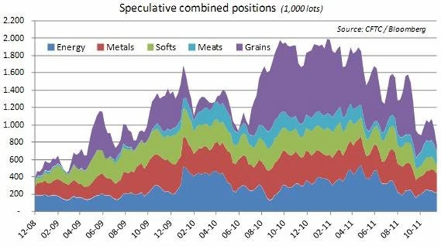 Hedgeové fondy i další velcí investoři pokračovali během listopadu ve snižování investic do komodit. Poslední data z CFTC (komise pro obchodování komoditních futures) ukázala, že ke snížení došlo u koše 25 komodit o 19 % na 770 tisíc lotů, což je nejnižší úroveň od července 2009 a výrazně pod nedávným maximem 2 milionů kontraktů v únoru. Nominálně investice během uplynulého týdne poklesly o 12 miliard dolarů na 76 miliard.