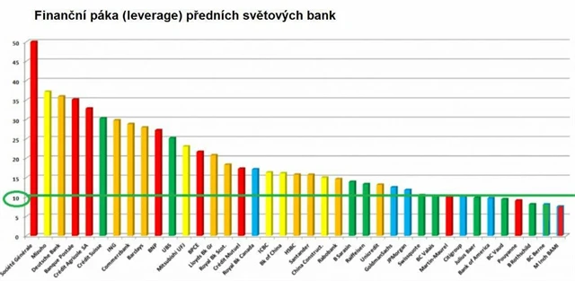 Finanční páka (leverage), kterou mají evropské banky, dosahuje v poměru 26:1, řada z nich však riskuje daleko více. Například francouzská banka Société Générale má dokonce "své sázky" nastaveny s kurzem 50:1, německá Deutsche Bank 35:1. Jen pro porovnání - investiční banka Lehman Brothers byla před krachem "napákována" 30:1. Americké banky, které na rozdíl od evropských po finanční krizi 2008 silně navýšily kapitál a prošly procesem tzv. deleveragingu, v současnosti využívají finanční páku jen v průměru 13:1.