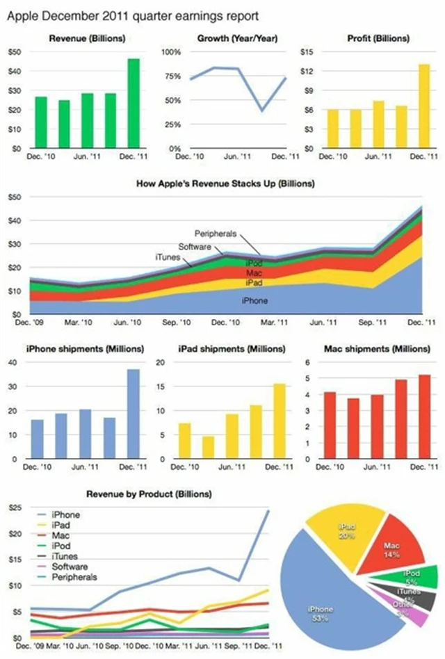 Výrobce počítačů, mobilních telefonů a elektroniky Apple svými čtvrtletními čísly překonal na plné čáře odhady investorů. Za poslední tři měsíce minulého roku vydělal 13,06 miliardy USD, což je 13,87 USD na jednu akcii. Odhad analytiků z Wall Street byl jen 10,07 USD na akcii. Také tržby, kterým citelně pomohly prodeje 37 milionů iPhonů, dosáhly rekordních 46,33 miliardy USD.