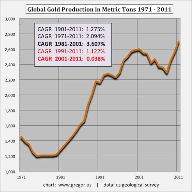 Světová produkce zlata roste tři roky po sobě, když předtím v letech 2001 až 2008 vždy klesala. Loni šlo o 2 700 tun zlata. Průměrný roční (CAGR) růst produkce ovšem za poslední dekádu výrazně klesl pod hodnoty z uplynulého století. Velcí těžaři v uplynulých letech spíše investovali do výzkumu, nabídku doplňovali menší "zlaté" firmy. Bude jejich příspěvek stačit k udržení růstu produkce zlata?