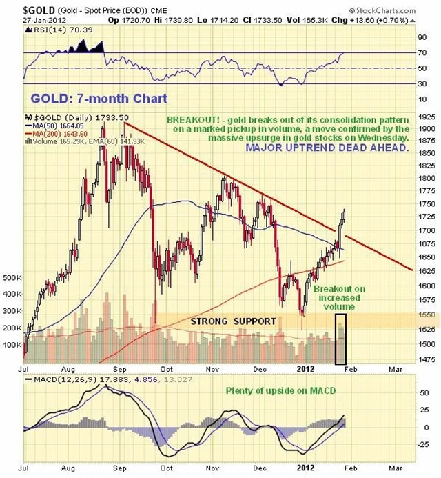 Cena zlata v posledních dnech utěšeně roste. Na grafu vidíme klesající červenou linku, kterou bylo zlato v posledních dnech schopné výrazně prorazit. Navíc se tento průraz konal za zvýšeného objemu obchodů. Lze tedy očekávat, že zlato bude dál pokračovat v růstu – indikátor MACD má ještě mnoho prostoru, než se stane překoupeným, což bude jeden z indikátorů toho, že je načase zlato opustit.