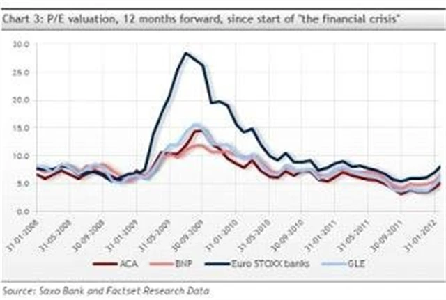 Když se podíváme na ocenění pořádně, stále vyjde levněji nakoupit akcie francouzských bank, než investovat do bankovní Evropy jako celku.