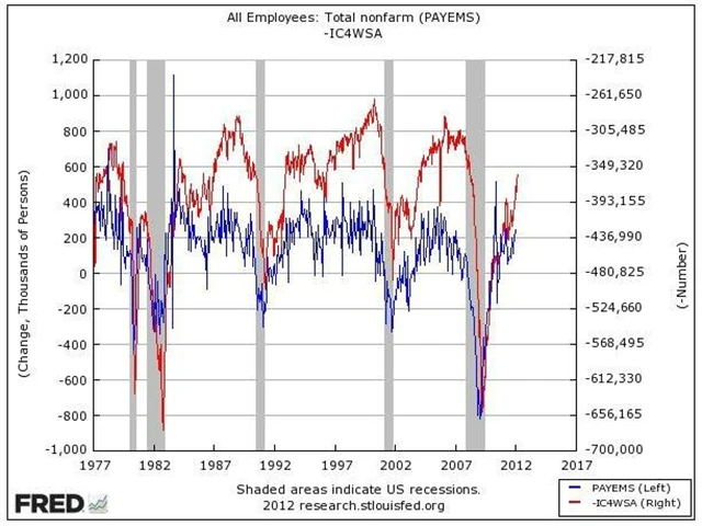 Graf na jedné straně znázorňuje, kolik měsíčně přibylo (respektive ubylo) v USA pracovních míst mimo zemědělský sektor (v modré barvě), a na straně druhé 4týdenní klouzavý průměr podaných nových žádostí o podporu v nezaměstnanosti (v červené barvě – zobrazeno převráceně). Za posledních 35 let pokaždé, když 4týdenní klouzavý průměr žádostí o podporu poklesl pod 375 tisíc, směřoval ukazatel tvorby pracovních míst nad hodnotu 250 tisíc. Přepočteno na podíl americké populace tento vývoj odpovídá míře nezaměstnanosti pod 8 %.