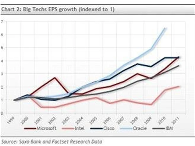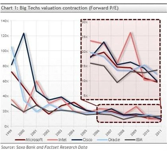 Jako mnoho dřímajících technologických gigantů poslední dekády byl i Microsoft a další požehnáni (nebo prokleti) fantastickými valuacemi během technologické bubliny v roce 2000. Některé z těchto hodnot byly dokonce tak vysoké, že se některým firmám dodnes na tyto úrovně nepodařilo vrátit.
