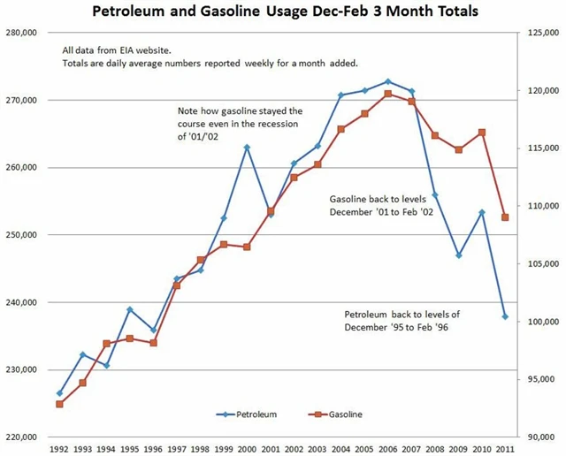 Obrázek znázorňuje vývoj spotřeby ropy (modrá čára) a benzínu (červená čára) v USA v období prosince až února od roku 1992. Spotřeba obou dvou statků konstantně klesá od roku 2007. Spotřeba ropy se v posledním sledovaném období dostala až na úroveň z období prosince až února z přelomu let 1995/96. Spotřeba benzínu je na úrovni z přelomu let 2001/02. To dokresluje stav amerického hospodářství. Na jedné straně trh práce jeví známky mírného zotavení, ovšem toto zotavení je v porovnání s minulostí slabé, a na druhé straně výše uváděná spotřeba ropy a benzínu ukazuje, jak je hranice mezi mírným hospodářským oživením a opětovným sklouznutím do recese křehká. Nicméně lze konstatovat, že bude-li tento trend pokračovat až do konce roku 2012, může prezident Obama splnit cíl snížit emisi skleníkových plynů o 15 procent na základě čísel z roku 2005 již v letošním roce,a ne až v roce 2015.