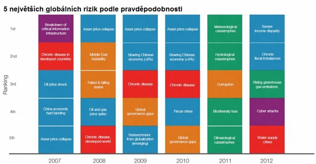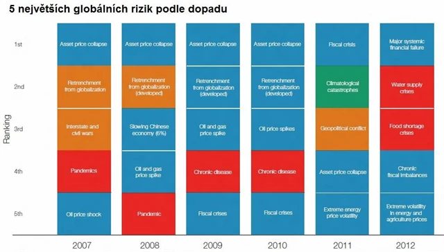 Světová banka ve svém nedávném výhledu na globální rizika pro letošní rok nezapomněla na světová finanční rizika ani na nedostatek vody. Za nejpravděpodobnější považuje nerovnost příjmů lidí, chronické fiskální nerovnováhy, růst emisí skleníkových plynů, kybernetické útoky a nedostatek vody. Jako největší rizika co do dopadu vidí velký systémový finanční kolaps, nedostatek vody a potravin, chronické fiskální nerovnováhy a extrémní kolísání cen zemědělských komodit a energií.