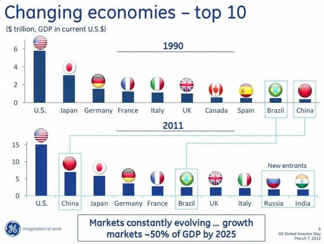 Největší ekonomikou světa zůstávají Spojené státy, ovšem Čína si na jejich pozici brousí zuby. Jak je vidět na grafu, který minulý týden na svém setkání s investory používala společnost General Electric, země BRIC vzaly za posledních dvacet let první desítku světového pořadí útokem. Z ní naopak vypadly Kanada a Španělsko.
