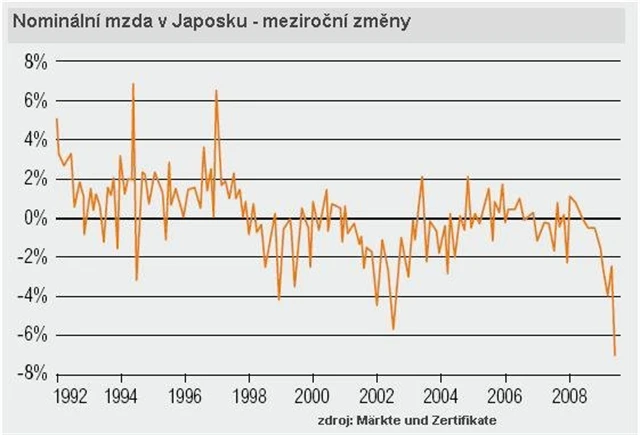 Nominální mzdy klesají od roku 1998 a rok 2008 přinesl další znatelné snížení.. Oficiální míra nezaměstnanosti je 5,4%, což odpovídá 3, 48 milionům nezaměstnaných. Vláda však vychází z toho, že v japonských podnicích je dalších 6 milionů „interně nezaměstnaných„ lidí.
