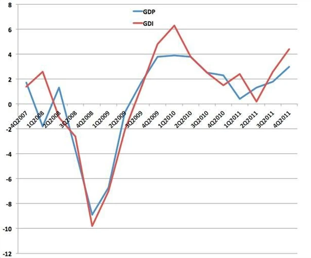 Minulý týden byl ve Spojených státech potvrzen růst HDP ve 4. kvartálu 2011 o 3 %. Osobní spotřeba pak v pátek příjemně překvapila, když ukázala, že se Američané aktuálně nebojí utrácet. Výkonnost ekonomiky se ovšem místo HDP dá měřit ještě jinak - takzvanou paritou kupní síly. Ve Spojených státech se označuje jako GDI (gross domestic income, tedy hrubý domácí příjem). Normálně by měl tento parametr ekonomiky odpovídat HDP, ve Spojených státech se ovšem liší.