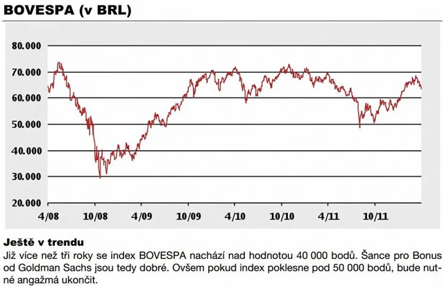 Komfortně lze vstoupit na brazilský trh prostřednictvím bonus certifikátu od Goldman Sachs (ISIN DE000GS144Q5). Produkt má bariéru na úrovni 40 000 bodů, která je v aktuálním tržním prostředí vzdálena zhruba 35 %. Pokud tato bariéra zůstane až do července 2013 nedotčena, splatí emitent cenný papír minimálně ve výši 95 BRL, tedy necelých 40 eur. Investice dává investorům prostor dosáhnout při stagnaci výnosu 13,7 %, tedy zhruba 10,5 % p.a.