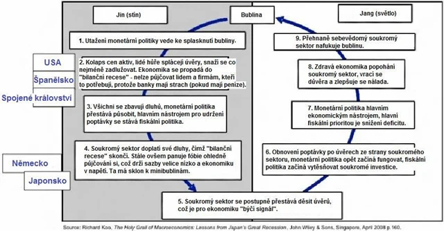 Ekonomika se vyvíjí v cyklech - nic nového. Richard Koo z Nomury ovšem využil tradiční filosofický koncept jin a jang, ženského a mužského principu, tmy a světla. Všechny vyspělé země jsou ve fázi stínu, ovšem Německo a Japonsko jsou podle tchaj-wanského ekonoma nejblíže k přechodu do světlé, tedy pozitivní fáze cyklu.