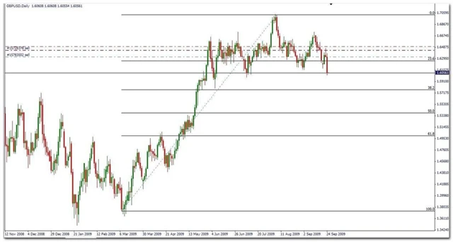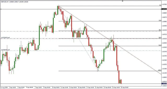 Během dalších čtyřech obchodních dní byl vytvořen sestupný trend, který nabíral na síle a v pátek 18.9.2009 byla prolomena úroveň 50 % Fibo. Po tomto průrazu se cena prakticky zřítila až k úrovni 1,61, kde se nachází spodní část ramene dříve zmíněné formace. Během pondělí se trh stabilizoval a v průběhu úterní seance umazal většinu pátečních ztrát.