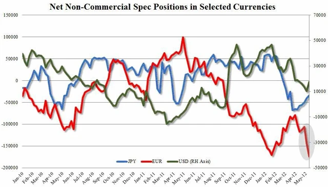 Graf znázorňuje vývoj stavu čistých pozic na vybraných měnách. Levá číselná osa je pro euro a japonský jen, pravá pro americký dolar. Záporné hodnoty znamenají, že je součet všech pozic na dané měně záporný, tudíž investoři spekulují na oslabení měny. Naopak je to u kladných hodnot – investoři spekulují na posílení dané měny. Vidíme, že euro (červeně) je na historickém minimu. Proto lze v nejbližších dnech s velkou pravděpodobností očekávat, že na trh přijde pozitivní zpráva, po které budou spekulanti nuceni své krátké pozice zavírat.