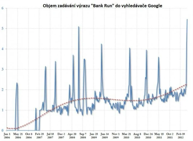 Vyhledávaní fráze "bank run", tedy výrazu pro útok střadatelů na banky, dosáhl na vyhledávači Google v posledních dnech historických maxim. Dokonce přesáhl hodnoty z doby vrcholící krize po pádu banky Lehman Brothers na podzim 2008. Vyhledávaní dominuje anglická verze "bank run". Regionálně nejvíce dotazů přichází překvapivě ze Singapuru, dále z USA a Nizozemska. Nejméně tento výraz pro panické vybírání vkladů z bank zajímá Němce.