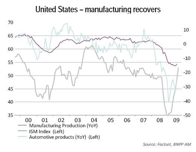 Podle indexu ISM se výroba vrátila k růstu (nad hodnotu 50 bodů indexu) poprvé od ledna 2008. Hodnota 52,9 odpovídá historicky zhruba 3,7 procenta ročního růstu HDP. Ten ve 2. čtvrtletí klesl v USA o jedno procento. Obě složky indexu – zaměstnanost a objednávky – se ovšem v srpnu zlepšily.