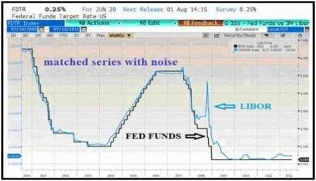 Je zde jeden dosah zkreslených sazeb, o kterém se dosud prakticky mlčí. Podívejte se na graf porovnávající LIBOR se sazbami Fedu. Korelace je s výjimkou podzimu 2008 prakticky dokonalá.