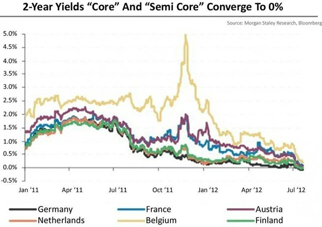 S výnosy španělských a italských dluhopisů hýbou spekulace a informace o možné pomoci ECB nebo evropských záchranných fondů tamním ekonomikám, v Evropě ovšem v posledním půlroce až roce probíhá ještě jeden, neméně podstatný dluhopisový příběh. Výnosy dluhopisů v "bezpečných" zemích takzvaného jádra eurozóny se propadají, v mnoha případech se například 2leté výnosy dostaly na nulu, případně i do záporu. Investoři mají takový strach, že raději peníze "ukládají" s negativním výnosem, bojí se větších ztrát. Například belgický 2letý výnos ještě na podzim 2011 dosahoval 5 %, nyní je na nule.
