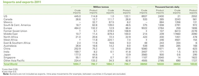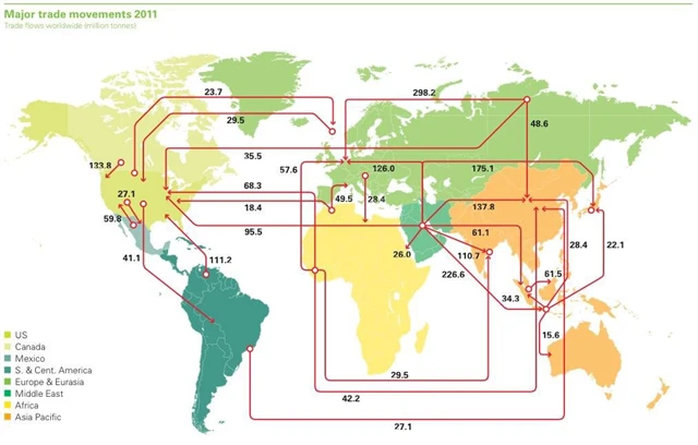 Trh s ropou je jedním z hlavních ekonomických témat. Ať se v Evropě žení třeba všichni čerti a v Číně roste HDP "jen" o 7,5 %, černé zlato bude v příštích desetiletích stále zdrojem obrovského bohatství pro země, které mají velká ložiska, a také jablkem sváru v řadě diplomatických a válečných konfliktů. Jak jsou na tom jednotlivé světové regiony s dovozem a vývozem této suroviny, přehledně zobrazuje mapa z dílny BP.