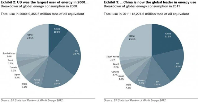 Americká banka Goldman Sachs minulý týden vydala zprávu o energetické situaci v Číně. Součástí prezentace je i graf, který zobrazuje vývoj spotřeby energie ve světě za uplynulých 11 let. zatímco v roce 2000 se celosvětově spotřebovala energie odpovídající 9,35 miliardám tun ropy, v roce 2011 to podle údajů BP bylo již 12,27 miliardy tun. Největším skokanem za zmíněné období se na úkor například USA, Japonska a Evropské unie stala Čína. Vzrostl i podíl Indie a Brazílie na globální spotřebě energie.