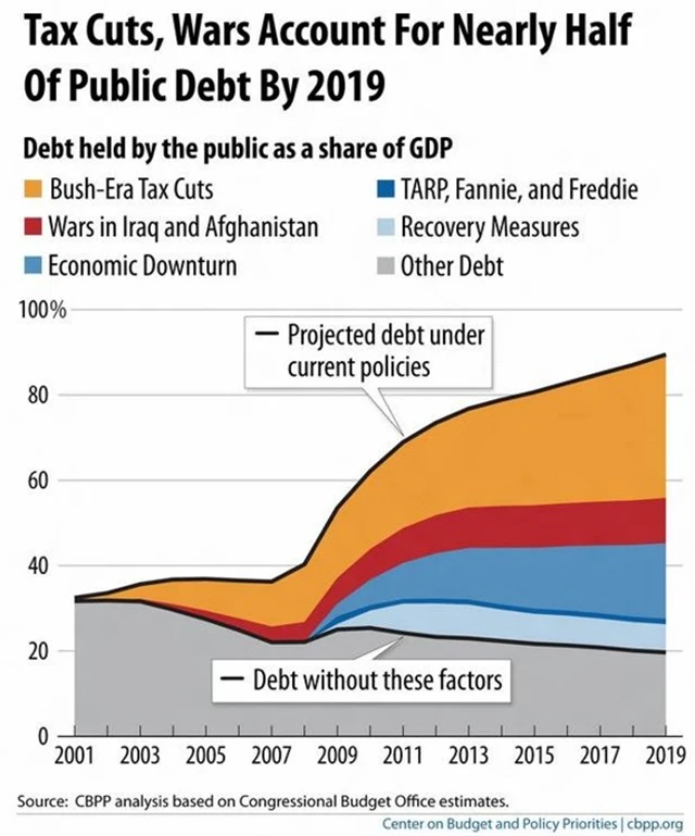 Daňové úlevy a válečné konflikty - to mají být největší důvody prohlubování amerického zadlužení. Až po nich přijdou na řadu ekonomické zpomalení, investice do oživení a záchrany bankovního systému. Graf je starší než rok, přišli s ním analytici z Center on Budget and Policy Priorities, ovšem směrem ke konci roku a blížícímu se "fiskálnímu útesu" dobře připomene, o co se také hraje v amerických volbách. Obama plní sliby a stahuje vojáky ze zahraničních misí, běžné Američany ale jistě ještě víc zajímají zmíněné daňové úlevy zavedené administrativou jeho předchůdce Bushe.