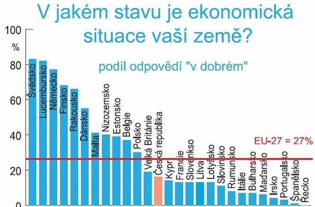 Podle nejnovějšího Eurobarometru (průzkumu veřejného mínění zadávaného Evropskou komisí) je pouze 16 % Čechů přesvědčeno, že se jejich národní ekonomika nachází v dobrém stavu. 84 % Čechů si myslí, že se česká ekonomika nachází ve velmi špatné situaci. Češi se tak dostali pod evropský průměr, který činí 27 %, na 13. místo. Podle průzkumu se názory Evropanů značně liší. Zatímco ve Švédsku nebo Lucembursku věří národní ekonomice přes 80 % obyvatel, ve Španělsku je optimistické pouze 1 % dotázaných, v Řecku kladně neodpověděl dokonce ani jeden respondent.