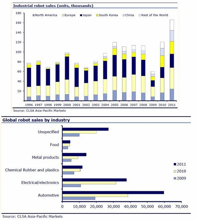 Technologie dobývají světovou ekonomiku, mimo jiné i pracovní trh, kde pomalu ale jistě nahrazují živé pracovníky. Raketově vzrůstající tržby z prodeje robotů naznačují, že je o elektronické pracanty stále větší zájem. Statistiky Mezinárodní federace robotiky nabízejí zajímavý pohled. Není pochyb, že robotika je cyklickým odvětvím, nicméně rekord v tržbách z roku 2011 převyšuje o 38 % předešlý vrchol z roku 2005. Pracovních míst "kradou" nejvíce v automobilovém průmyslu.