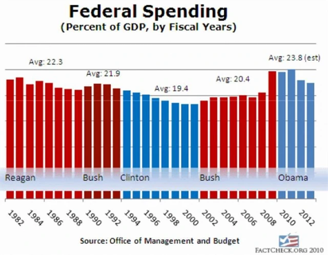 Výdaje federální vlády v USA za současného prezidenta Baracka Obamy (s odhadem letošní bilance) byly v poměru k americkému HDP nejvyšší za posledních třicet let a pět prezidentů. Je pravda, že Obama převzal "velení" ve složité situaci. Je však také pravda, že se nebál utrácet (a zadlužovat Ameriku). V případném druhém volebním období by jeho úkolem bylo vysoký poměr vládních výdajů vůči HDP snížit někam blíže k dlouhodobým průměrům.