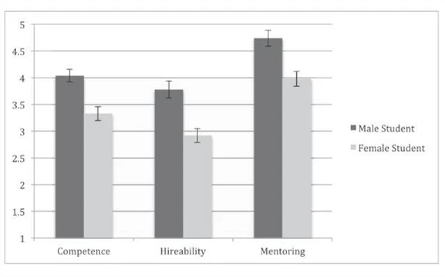 Proč je mezi vědci mnohem více mužů než žen? Možnou odpověď nabízí i průzkum mezi univerzitními profesory. Ti totiž (nehledě na to, zda jde o muže-profesory nebo ženy-profesorky, vždy šlo ovšem o profesory biologie, fyziky nebo chemie) označili muže za lepší ve většině důležitých charakteristik - kompetentnosti, šancí na trhu práce, případně vlastní chuti takové student(k)y vést v další kariéře.