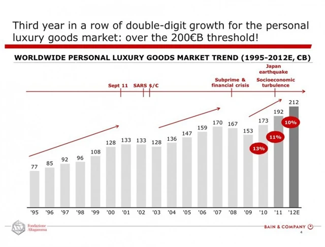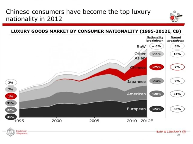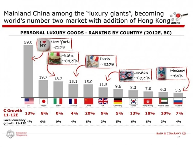 Trh s luxusním zbožím by se měl v roce 2012 nafouknout o zhruba 10 % na 212 miliard eur. Tvrdí to konzultantská firma Bain & Company ve své roční zprávě o situaci na trhu s luxusními výrobky. Motorem světové poptávky zůstává Čína, která obstarává polovinu asijského trhu. Jako národ Číňané v podílu na světových nákupech letos mají předstihnout i Američany. V prezentaci zprávy je zajímavý i graf, který odhaduje podíl jednotlivých metropolí na trhu v dané zemi.