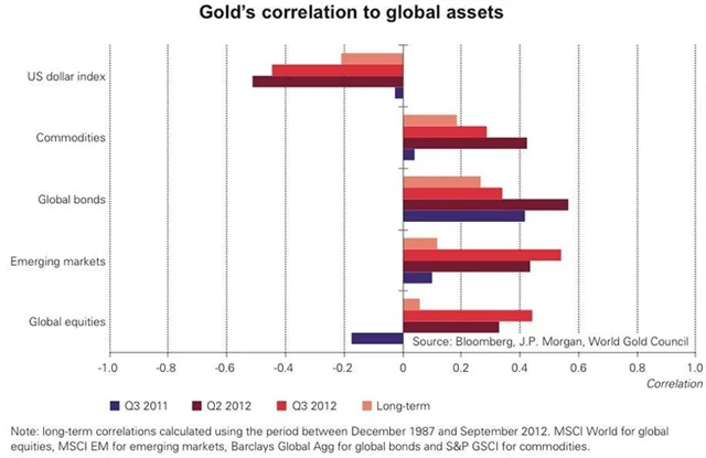 Řada poradců doporučuje zlato jako vhodný prvek diverzifikace portfolia. Snižuje totiž jeho celkovou volatilitu, protože příliš nekoreluje s jinými aktivy. Jak ovšem ukazuje graf z aktuální zprávy Světové rady pro zlato (World Gold Council), korelace jsou v posledních čtvrtletích také hodně volatilní. Co platilo před rokem, může být aktuálně výrazně jinak. Jedinou jistotou tak zůstává negativní korelace s americkým dolarem, v němž je cena zlata nejčastěji počítána.