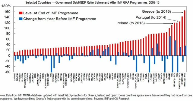 General Resources Account - mnozí z nás si nic nepředstaví. Zkratka GRA skrývá program finanční pomoci ze strany Mezinárodního měnového fondu, který nyní probíhá například v Řecku nebo Portugalsku. Jak ukazuje graf, řadě zemí vzrostlo zadlužení v době trvání programu (většinou tříletého) poměrně výrazně. Jeho cíl, tedy stabilizace a nastartování ekonomického růstu, pak mnohdy zůstal nenaplněn. Podobně jako (zatím) v případě Řecka.