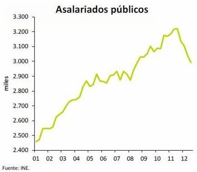 Graf znázorňuje vývoj počtu zaměstnanců ve veřejném sektoru ve Španělsku od roku 2001. Je z něj patrné, že vrchol nastal v polovině roku 2011 (3,22 milionů lidí), od té doby dochází k pomalému zeštíhlování státní správy.