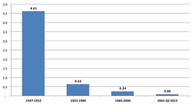 Graf znázorňuje vývoj přírůstku reálného HDP v USA (v dolarech) na každý dodatečný úvěrový dolar. V letech 1947 až 1952 každý vypůjčený dolar vytvořil dalších 4,61 dolaru, nyní je to pouze 8 centů. S rostoucím dluhem je totiž mezní přírůstek HDP stále nižší a nižší.