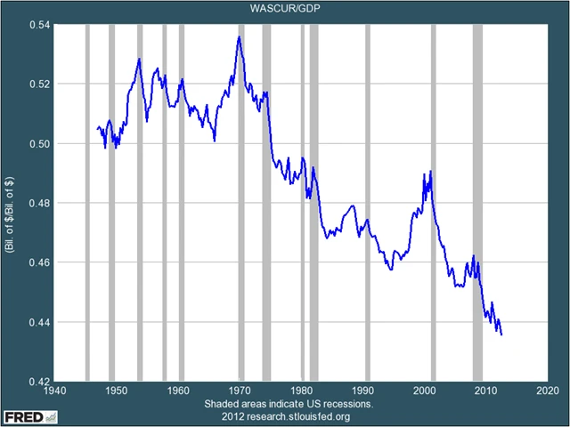 ...platy lidí v poměru k HDP klesají (kolik z ekonomiky dostanou na svou další spotřebu pracující).