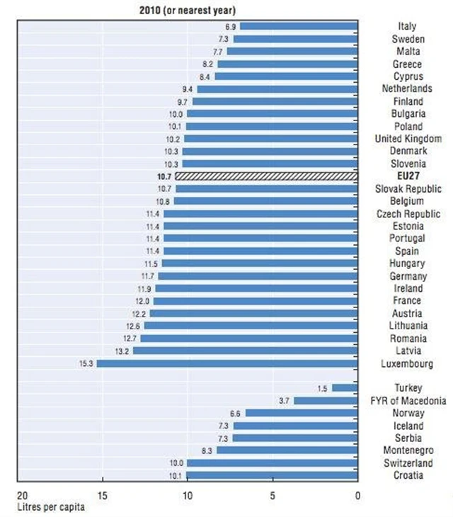 Ačkoli se říká, že Francouzi pijí víno i u ranního čištění zubů a severské národy zapíjejí depresi z dlouhých zimních nocí, nejvíce alkoholu na osobu se prodává v Lucembursku (15,3 litru ročně). Podle OECD jde ovšem o důsledek toho, že je v zemi evropských úředníků podprůměrně nízké zdanění alkoholu. Jinak žebříčku vévodí Lotyšsko a Rumunsko.