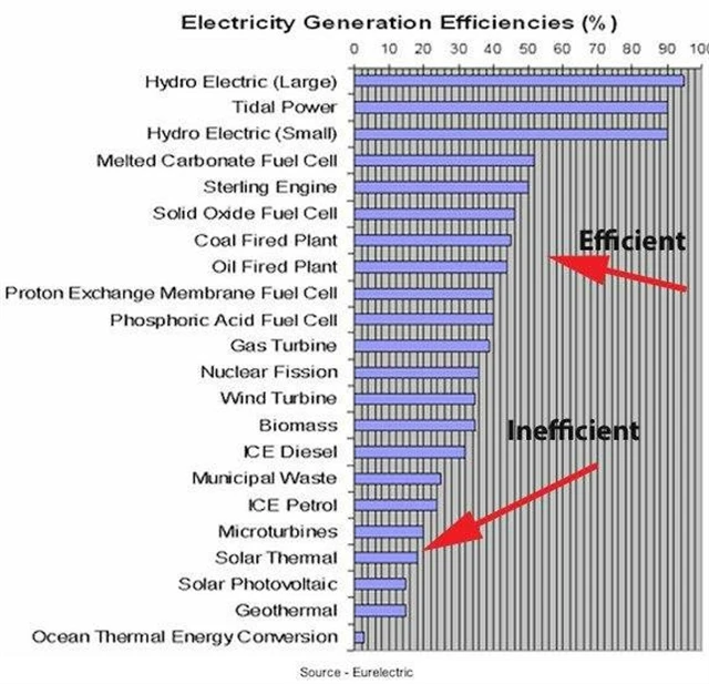 I když velké hydroelektrárny dokážou být ve výrobě energie nejefektivnější, jsou přímo závislé na výskytu vodních zdrojů. Stejné je to i s přílivovými elektrárnami, které jsou sice v efektivitě výroby na druhém místě, ale nelze je stavět mimo oblast pobřeží. Na dalších příčkách už se umisťují fosilní zdroje paliv, další takzvané "zelené energie" tabulku uzavírají. V České republice donedávna štědře podporovaná solární energie je v procentuálním vyjádření efektivity dokonce jen lehce nad 20 %.