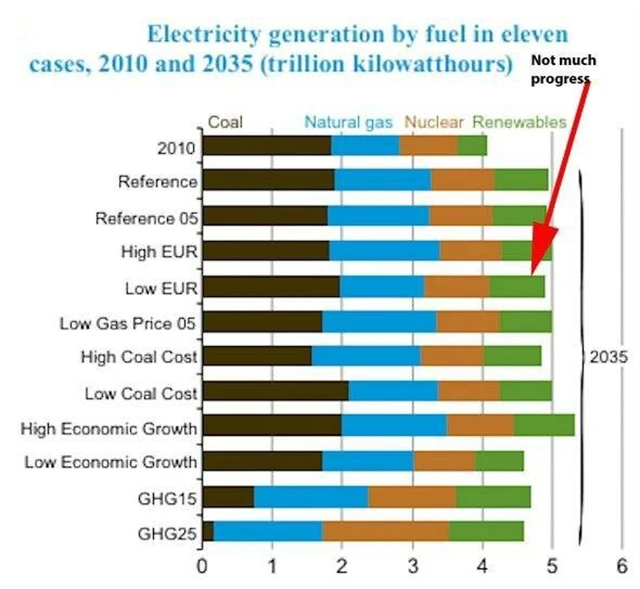 V rámci jedenácti variant vývoje světové ekonomiky se obnovitelné zdroje energie neukazují jako zrovna progresivně se vyvíjející možnost. Stabilně dobře by na tom v roce 2035 naopak mělo být uhlí, které by zaznamenalo nárůst těžby především ve chvíli, kdy by jeho ceny spadly níže. Špatně by si ale nevedlo ani v případě slabého eura. Propad v řádu desítek procent by přišel ve chvíli, kdy by se státy rozhodly snížit emise skleníkových plynů.
