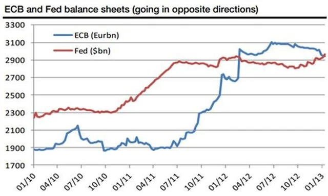 Bilance Evropské centrální banky se začala smrskávat. Zatímco americký Fed dál tiskne nové peníze ostošest, ECB již skoro rok do bilance nic většího aktivně nepřikoupila. Proto se bilance ECB snížila na roční minimum (2,93 bilionu eur). Navíc ECB nedávno bankám umožnila předčasně splácet část peněz půjčených v rámci operace LTRO.