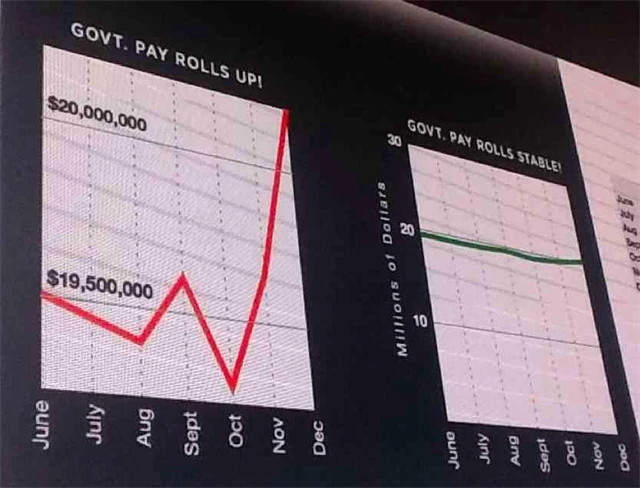 Někdo používá data k tomu, aby ukázal pravdu, a někdo je využívá tak, aby pravdu zakryl. Soudy nechme na někom jiném, vždy ale pamatujme na to, že se dá s jedněmi daty manipulovat tak, že vyznívají vždy zcela odlišně. Výborně to ilustruje graf z nedávné prezentace na jedné americké škole designu. Levý obrázek by se dal popsat jako raketový růst, druhý jako klidné moře.
