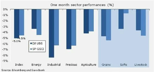 Během února zaznamenaly oba hlavní komoditní indexy podobné ztráty, ačkoli pokrývají odlišné spektrum komodit. Ztráty se dotkly všech sektorů, včetně těch zemědělských. Největší rány přitom utrpěly vzácné a průmyslové kovy.
