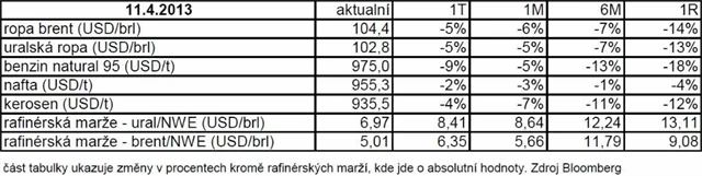 Cena ropy Brent kolísá kolem 110 USD za barel (cena se v pásmu 100 až 120 USD převážně pohybuje od začátku roku 2011) kvůli kombinaci poněkud optimističtějších vyhlídek světové ekonomiky (a tedy vyššího očekávaného růstu spotřeby) a trvající napjaté situace na Blízkém a Středním východě. Výkyvy ceny souvisí především s krátkodobými fluktuacemi nálady trhu vyvolanými aktuálními událostmi (zveřejňovaná data, evropská dluhová krize).