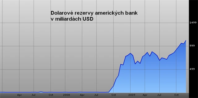 Americké banky hromadí peníze, které Fed pumpuje do ekonomiky a bankovního sektoru s cílem rozdmýchat uhasínající úvěrový plamen. V současnosti je objem rezerv v amerických bankách vyšší než jeden bilion dolarů, tedy mnohem větší, než banky musejí držet jako záruku volných vkladů.
