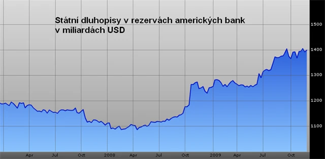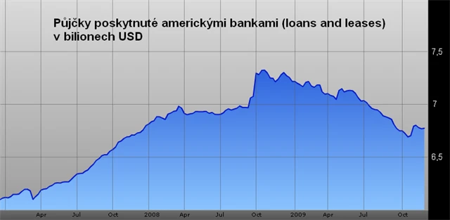 Nic nenasvědčuje tomu, že by americké banky více půjčovaly. Od října 2008 do října 2009 klesl objem úvěrů dokonce o 5,3 procenta. To odpovídá osmiprocentnímu poklesu půjček a růstu objem u cenných papírů držených bankami o 3,4 procenta. mezi nimi dominovaly státní dluhopisy, kterých přibylo 13 procent.