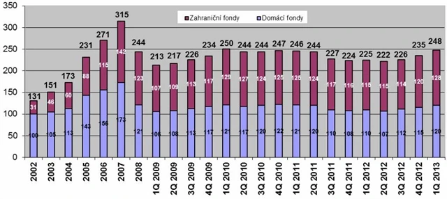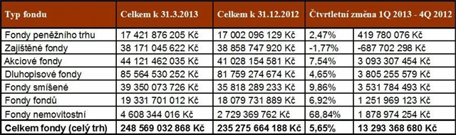 Celkový objem majetku investovaný přes členy Asociace pro kapitálový trh ČR do investičních nástrojů dosahoval ke 31. březnu 2013 917,636 miliardy Kč. Obyvatelstvo a instituce drží v domácích a zahraničních podílových fondech nabízených v České republice 248,57 miliardy Kč. Během prvního čtvrtletí 2013 tak majetek v podílových fondech vzrostl o 13,29 miliardy Kč, tedy o 5,65 %.