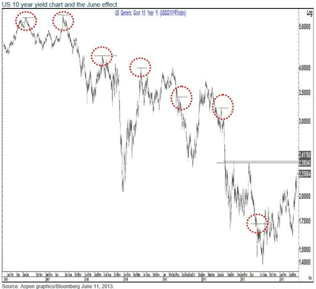 V letech 2006 až 2009 jsme byli svědky červnového růstu dluhopisových výnosů. Jenže potom se růst zlomil a výnosy se rychle propadly. A v letech 2010 až 2012 nastávala v červnu mírná rally na výnosech, která nakonec opět nevytrvala. Jak říká analytik ze Citigroup Tom Fitzpatrick, "každoročně jsme zvyklí opakovat akciovou mantru Sell in May and go away", pro dluhopisy však začíná platit Buy in June after the swoon".